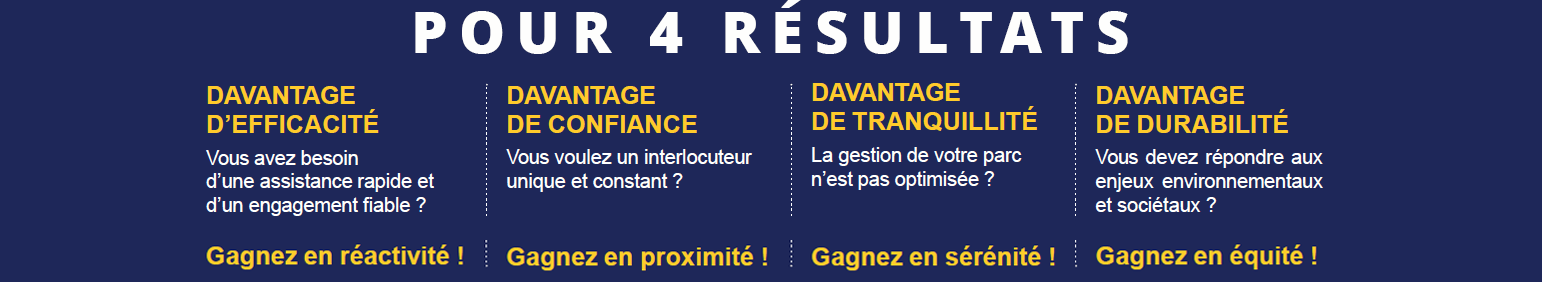 • Des outils de pointe pour le suivi, la gestion et l'optimisation des flottes (reporting, diagnostic, suivi des stocks, conseils en équipement ...) et de matériels adaptés aux interventions rapides (véhicules d'atelier équipés)